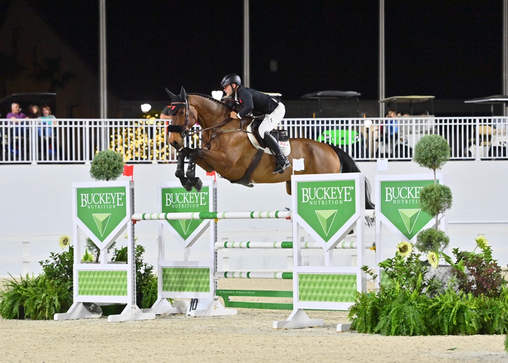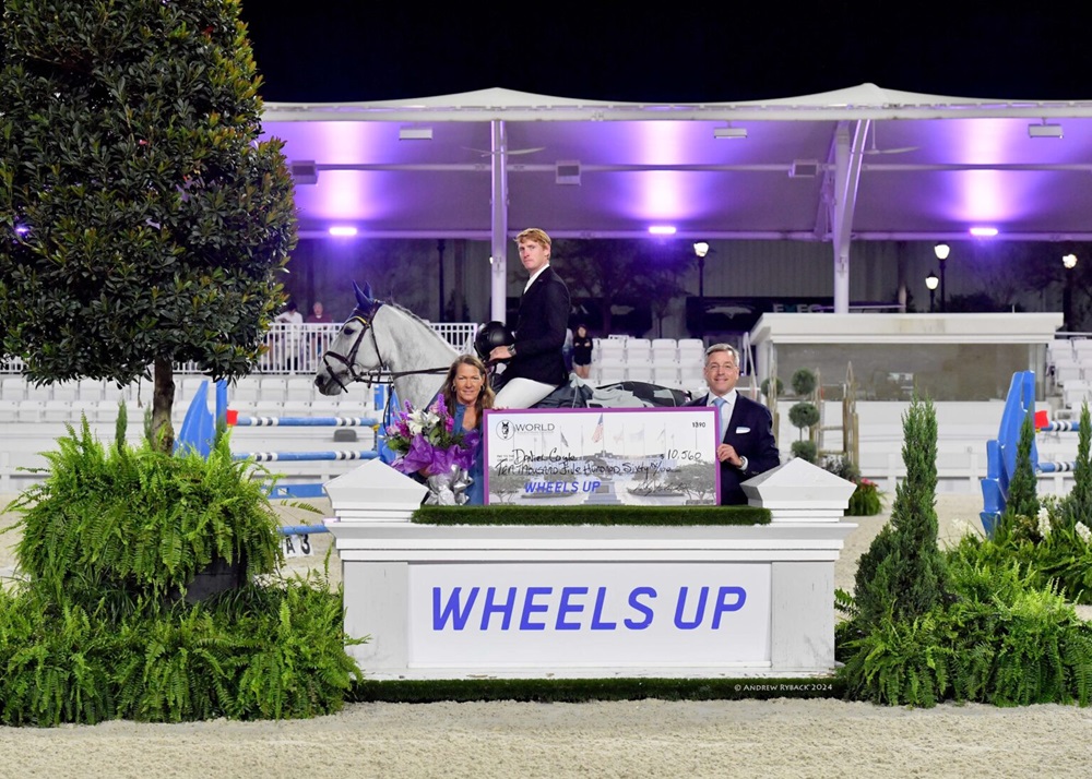 Ocala, Florida, USA – March 08, 2024 – Two-star competition took over the WEC Grand Arena on Friday night for the $32,000 Wheels Up Grand Prix Qualifier CSI 2*. Thirty-eight competitors representing nine different nations tackled the intricate tracks designed by Gregory Bodo (FRA) and Pieter Viste (BEL), but it was the trailblazing performance of pathfinder Daniel Coyle (IRL) and Ariel Grange’s young and talented Lena VDL that stole the spotlight.