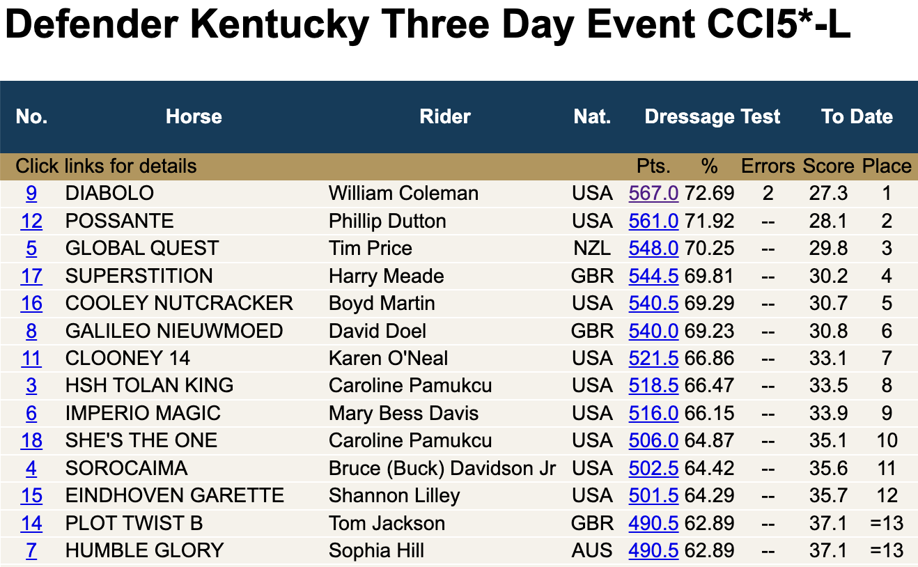 Defender Kentucky Three-Day Event: [Website] [Tickets] [Schedule] [Entries/Ride Times] [Scoring] [Volunteer] [CrossCountry App XC Map] [Venue Map] [Live Stream] [EN’s Coverage] [Support Our Sponsor: Kentucky Performance Products]