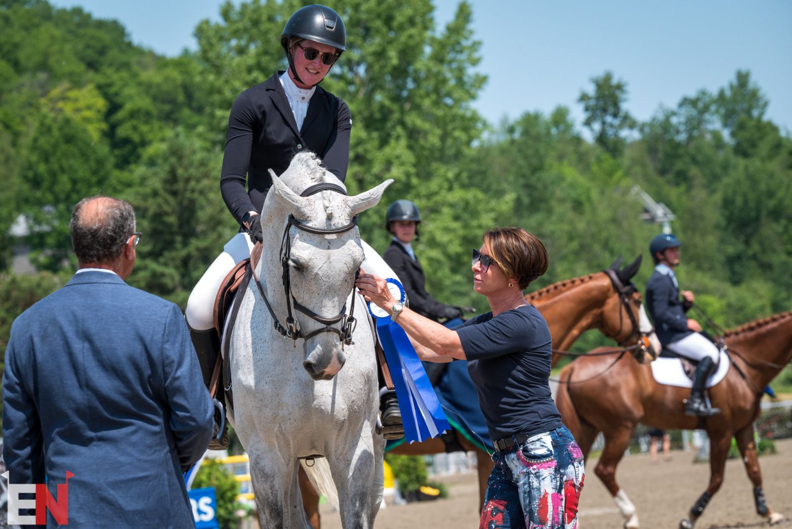 Bromont Rising coat Bettina Hoy pins the second place ribbon on Emeline Gilbert and EWSZ Mozart. Photo by Abby Powell.