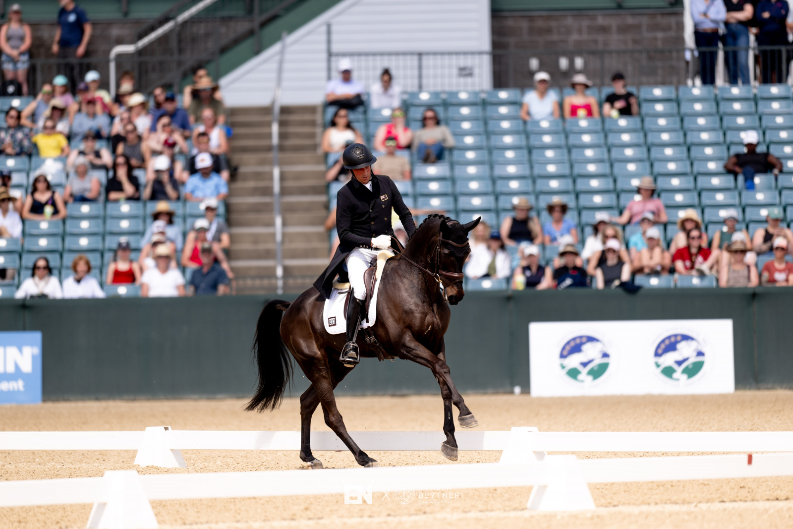 Similar to Monica’s approach, Caroline opted to just get Blake out in his jump tack for his pre-rides ahead of today, focusing on keeping the relaxation rather than drilling the movements he knows quite well with his extensive experience. “Since I’ve been here, I’ve done all my work in a jump saddle,” she continued. “I did do arena familiarization, only for a few minutes, in a dressage saddle, but all the other rides have been in a jump saddle and cavalettis. I’ve tried to stay out of the dressage arena because he knows his job and then I get a little nervous and ride him a little too backwards, so when I ride in a jump saddle and over cavaletti, I ride the horse and not get so stressed about everything else. He doesn’t need a ton of warm-up, just a little to get his back soft and get him into the movements and that’s about it.”