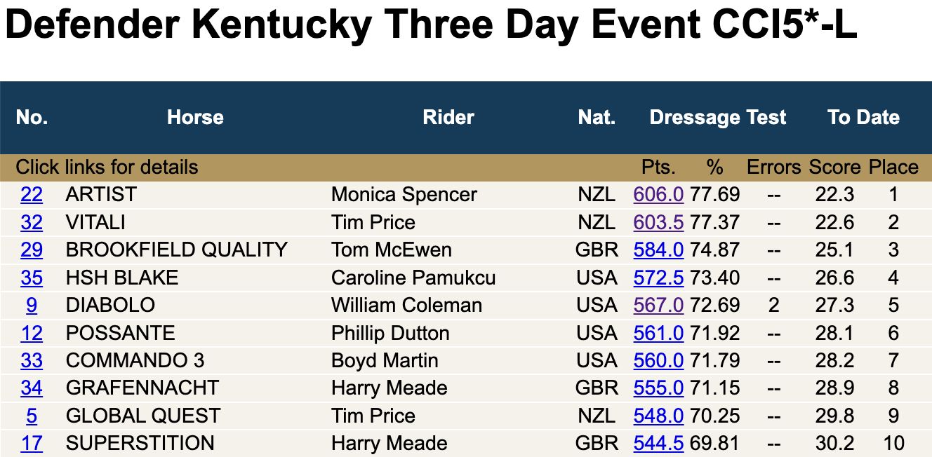 Defender Kentucky Three-Day Event: [Website] [Tickets] [Schedule] [Entries/Ride Times] [Scoring] [Volunteer] [CrossCountry App XC Map] [Venue Map] [Live Stream] [EN’s Coverage] [Support Our Sponsor: Kentucky Performance Products]