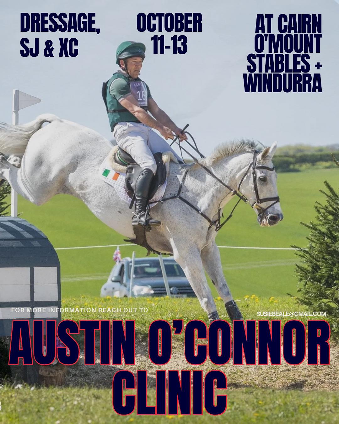 Next up, Irish Olympian and CCI5* winner Austin O’Connor, who’s teaching October 11-13 at Cairn O’Mount Stables in Malvern, PA. All levels are welcome for this clinic, and you’ll have the opportunity to ride on Windurra’s cross country course as well. Click here for more information and to register.