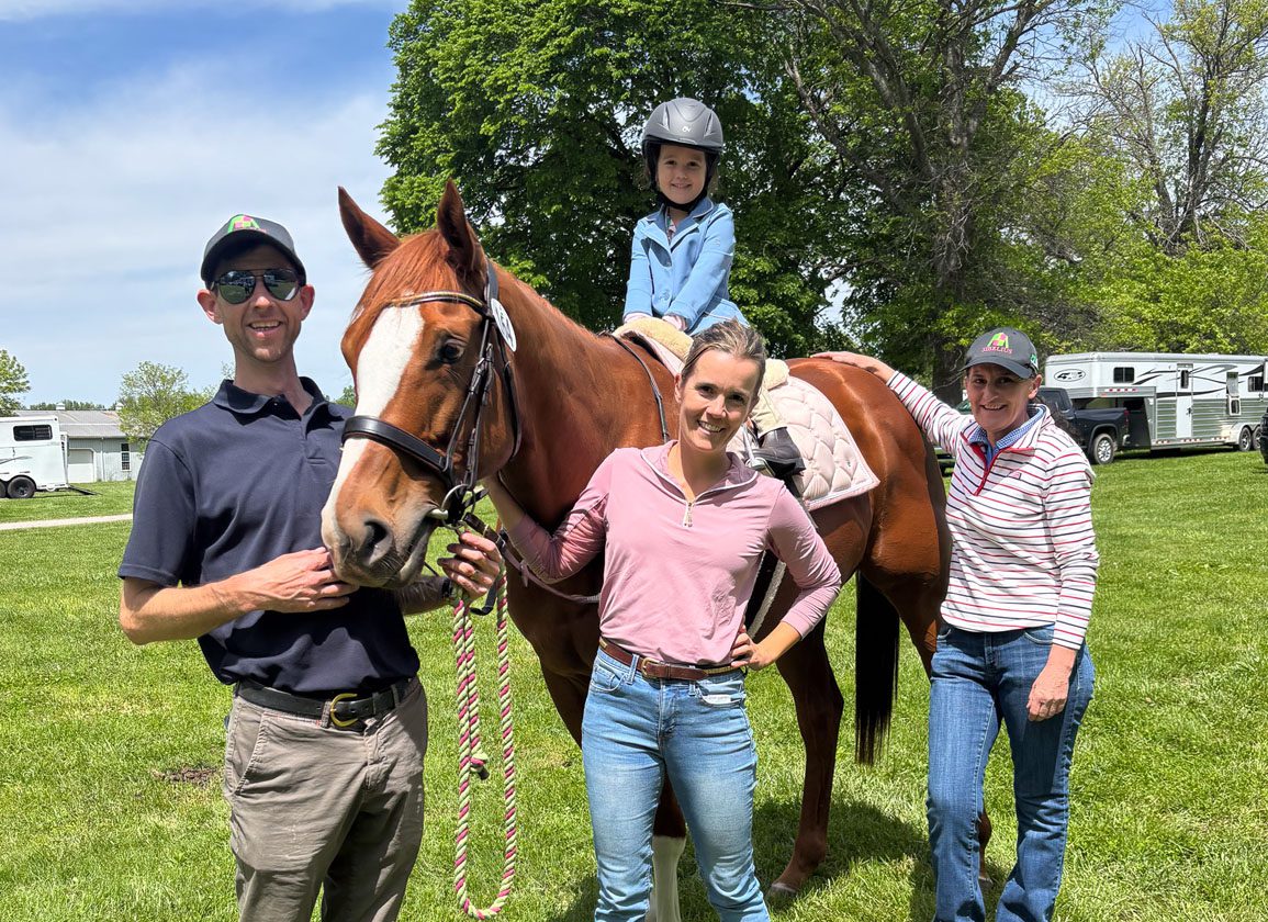 Sibelius with his racetrack trainer Jerry O’Dwyer, rider and dressage trainer Alison O’Dwyer, their daughter Adelaide, and racing owner Delia Nash. Photo courtesy of Alison O’Dwyer.