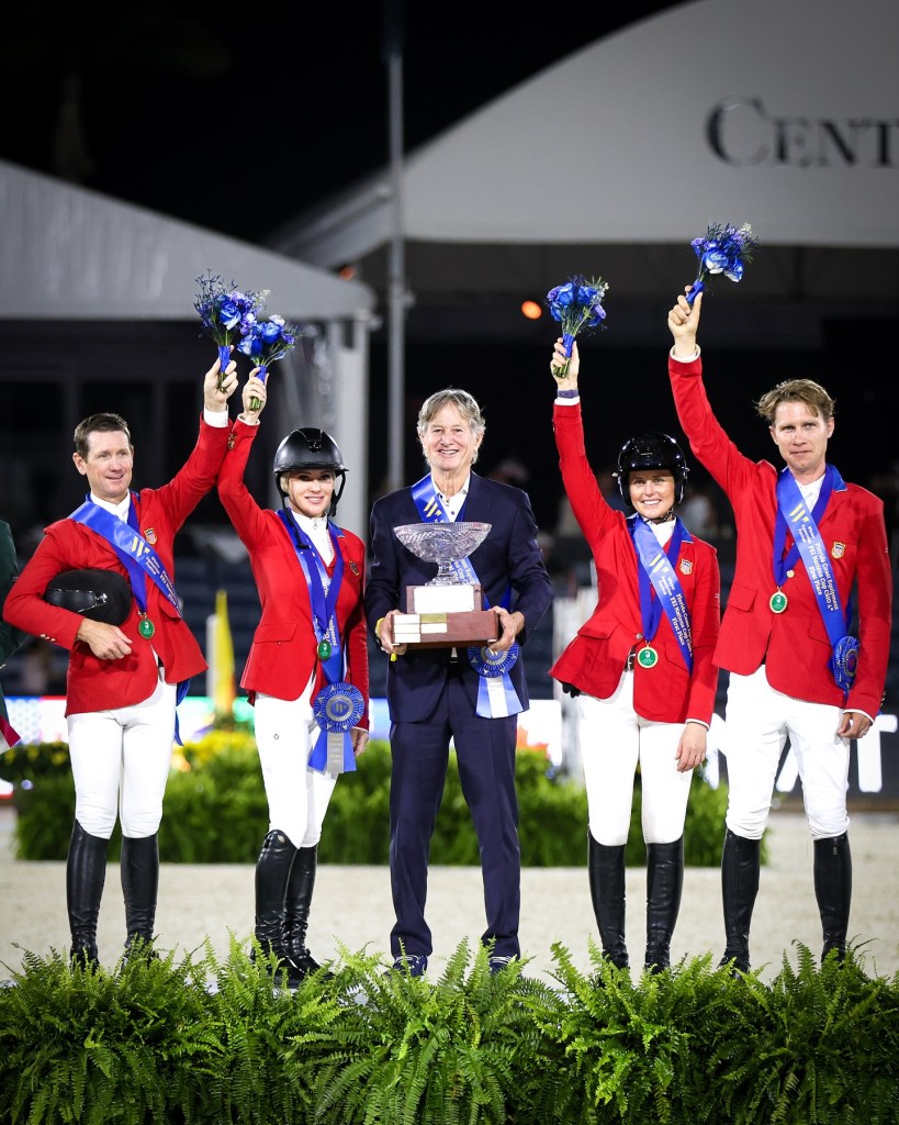 Wellington, United States – February 28, 2026 – The U.S. Jumping Team — made up of Karl Cook (USA), Callie Schott (USA), Marilyn Little (USA) and McLain Ward (USA) — earned its second consecutive victory in the $150,000 Nations Cup CSIO 4*, presented by Florida Coast Equipment. Eight countries brought forth teams to compete in the Saturday Night Lights highlight event of Week 8 at Wellington International’s Winter Equestrian Festival (WEF). Over the 25-year history of the FEI Nations Cup Wellington, the U.S. has now won 11 times.